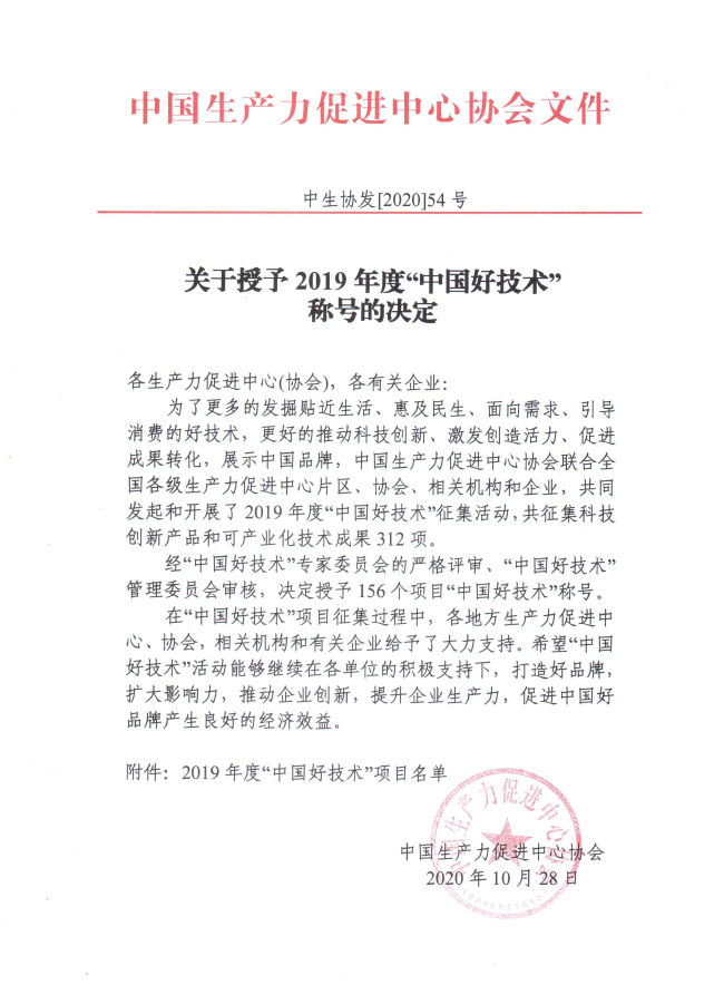 “中國好技術”的評選,旨在把好創意變成好產品、把好產品變成好品牌、把好品牌推向市場、讓好品牌產生效益。此次開展的2019年度“中國好技術”征集活動,共有科技創新產品和可產業化技術成果共312項,經“中國好技術”專家委員會的嚴格評審、管理委員會審核,最終授予156個項目“中國好技術”稱號。