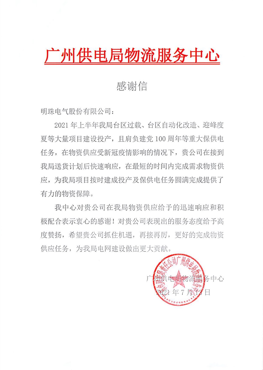 在收獲中標喜訊的同時,明珠電氣也收到了廣州供電局的感謝信,對明珠在今年上半年供應和服務中的迅速響應積極配合予以高度贊揚。明珠電氣將再接再厲,為廣大客戶提供更優質的產品與服務。